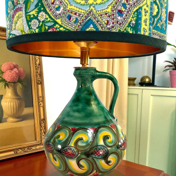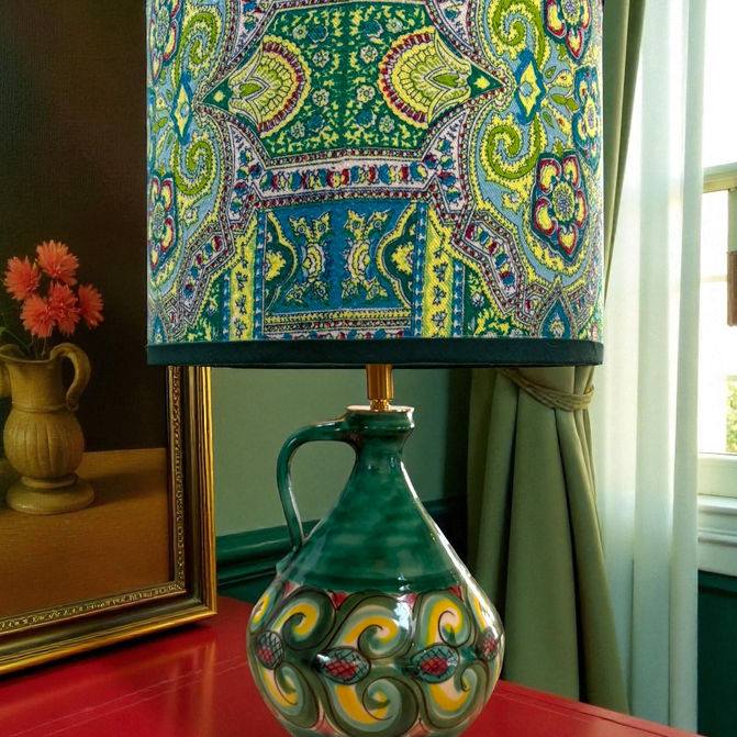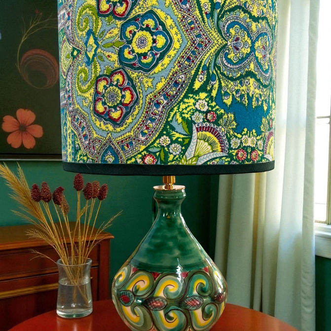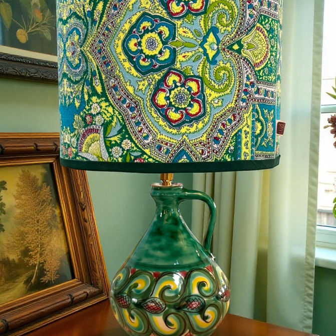 De vaasvoet, glanzend keramiek in dezelfde groentinten, vormt een perfecte tegenhanger: rond, vol, levendig. De binnenzijde van de kap is afgewerkt in warm goud, waardoor het licht een zachte gloed krijgt die elk patroon laat dansen.