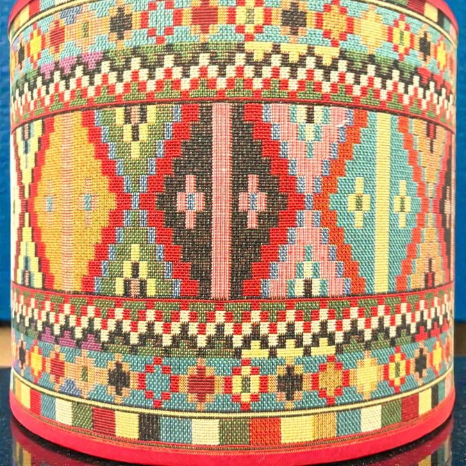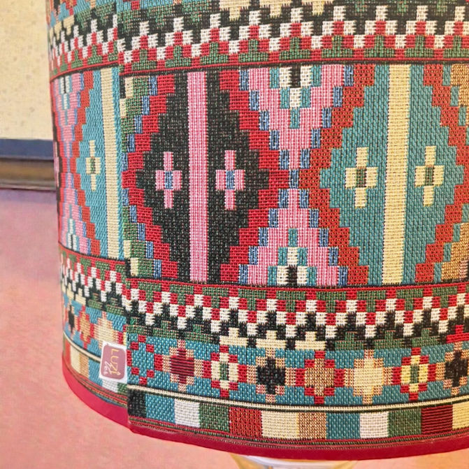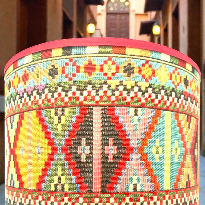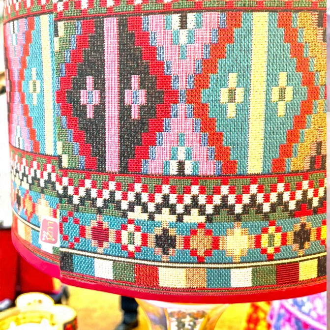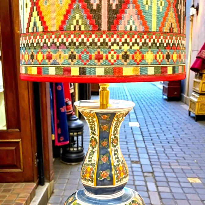 Een keramieken vaasvoet vol handgeschilderde florale panelen en daarboven een kap die rechtstreeks lijkt weggelopen uit een Marokkaanse tapijtwinkel. Patronen, kleur, ritme, warmte. Alles klopt, alles vlamt.