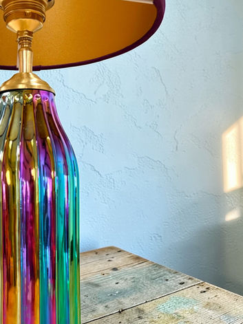 De geribbelde glazen voet vangt het licht en verschuift van goud naar magenta en petrol. Het oppervlak verandert subtiel afhankelijk van waar je staat. De goudkleurige fitting brengt rust in het kleurenspel.