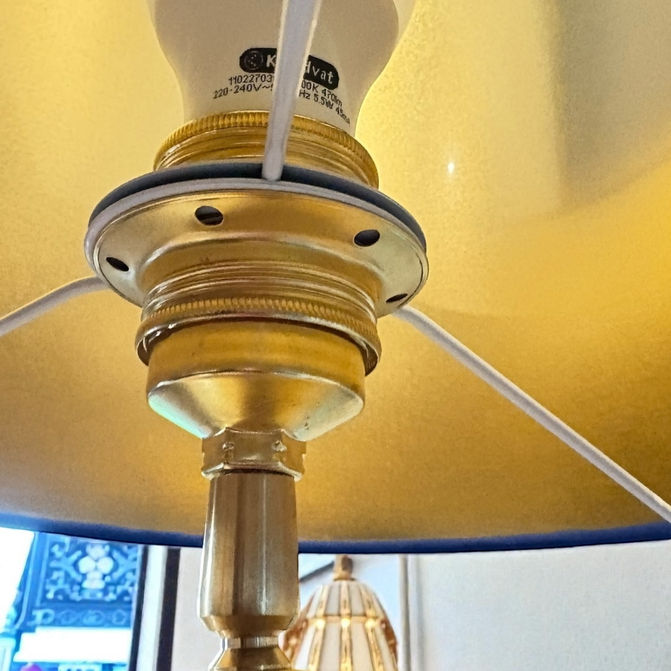 De blauwe bies maakt het geheel af, precies genoeg om de kleuren weer te vangen. En dankzij het kogelgewricht staat de kap altijd perfect recht, hoe vaak je de lamp ook verplaatst.